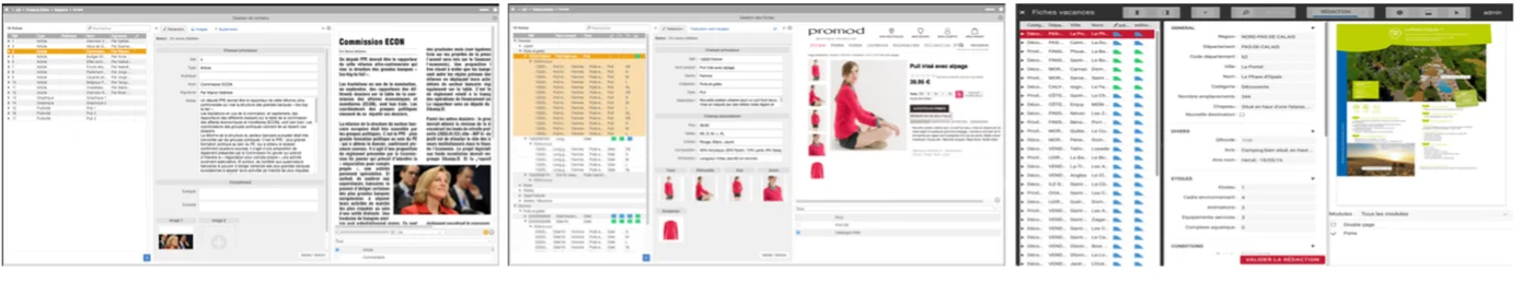 En partant de la cible (les publications web, mail, RS, catalogue, flyer, balisage, étiquettes, etc.), nous avons structuré un ou des modèles de fiches baptisées « offres », puis lié ces fiches aux différentes sources susceptibles de les renseigner, mais peut être aussi engagé des travaux manuels pour les compléter, ainsi que passé commande à des partenaires ou sous-traitants tels que des photographes, des traducteurs, ou des fournisseurs pour qu’ils apportent le matériel qui rendra nos offres riches et pertinentes.