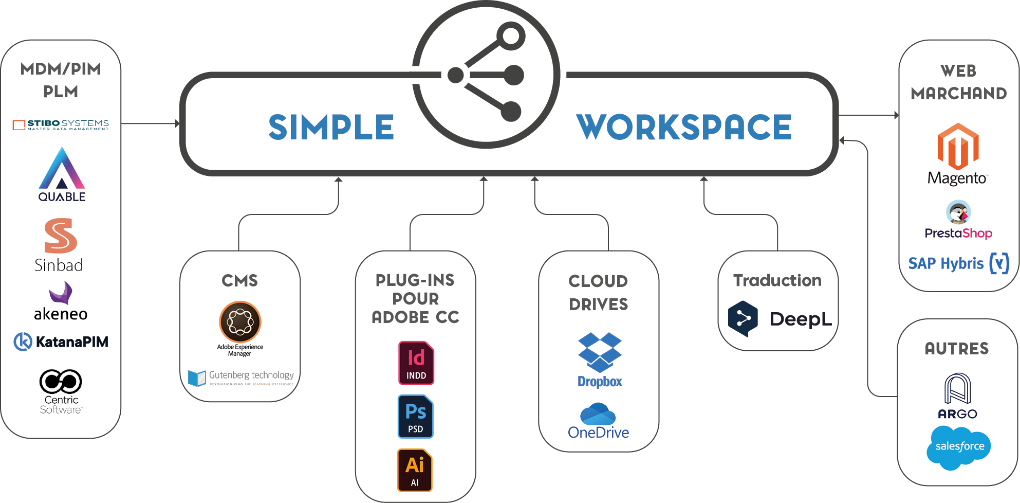 Que vous utilisiez un PIM pour la gestion produit, un PLM pour le suivi des collections, un ERP pour les prix, ou encore un CMS pour votre vos contenus éditoriaux, Simple Workspace est conçu pour agréger automatiquement les informations issues de toutes ces sources.