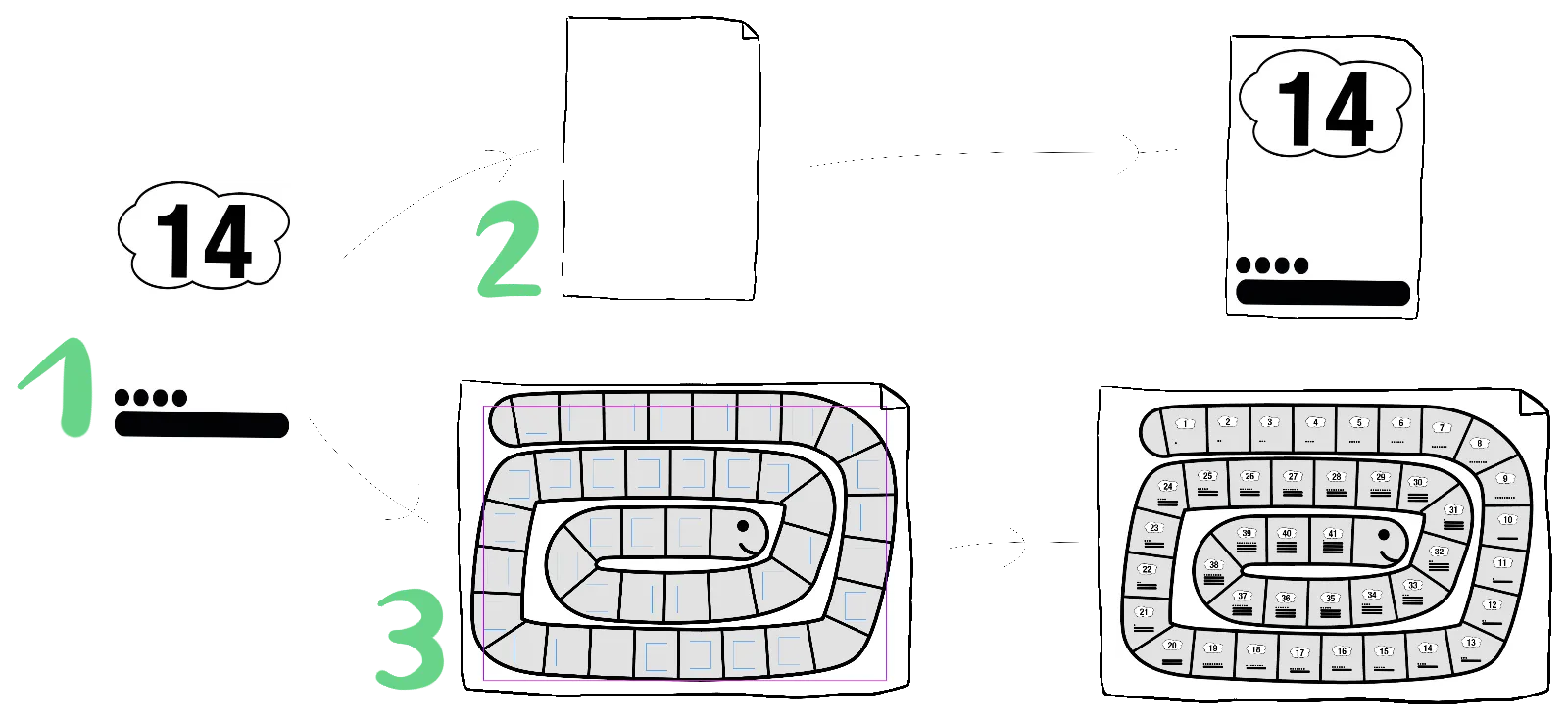 J2S Module Editor created the page, placed the drawing of the goose game on it, and prepared the 41 placement areas. All that remained was to run the tens and units module 41 times. Since the whole database has been run through, we’ll stop here!