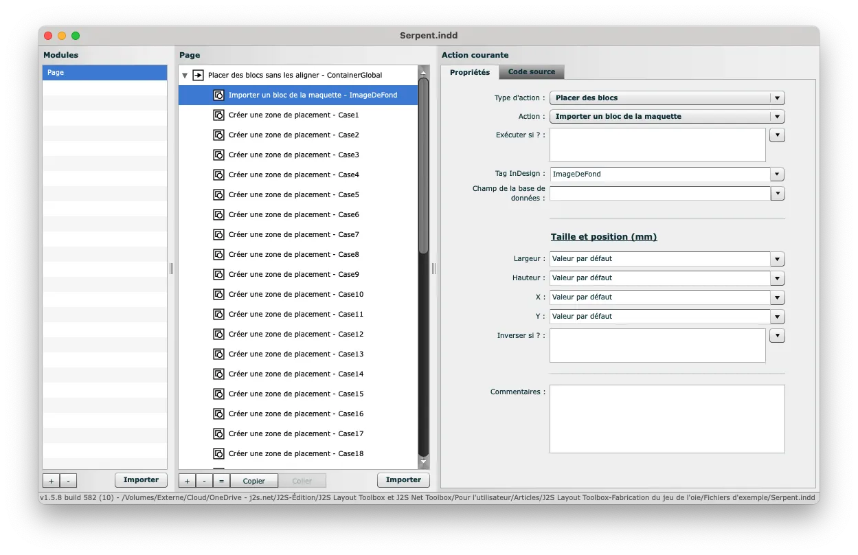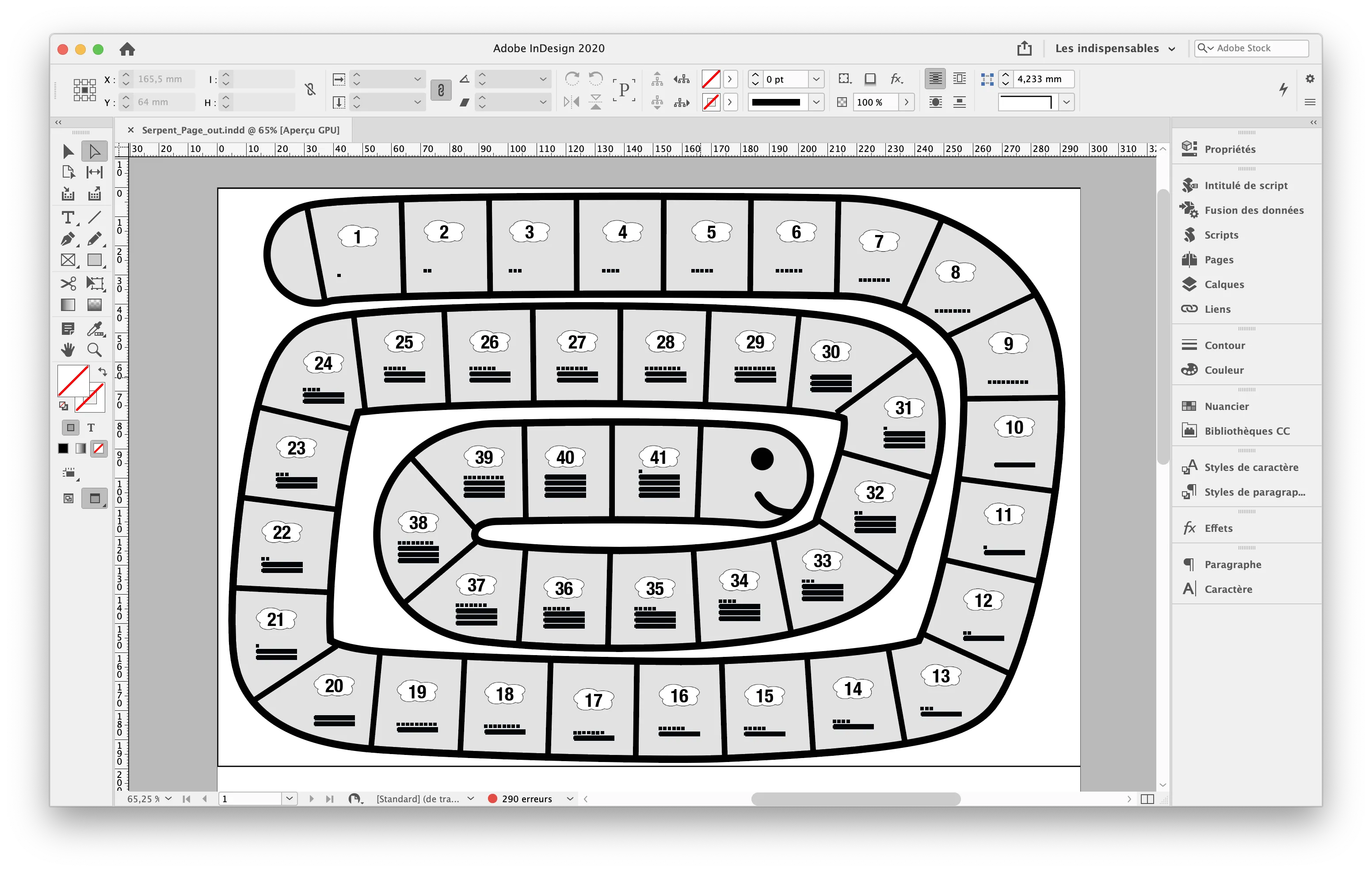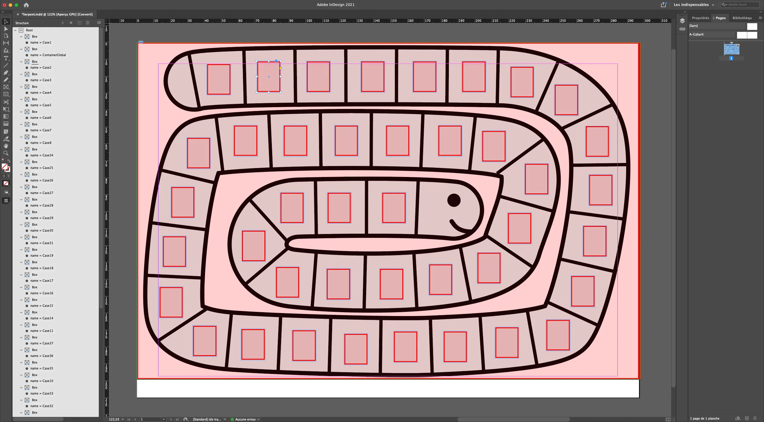 The InDesign file has my goose game design, in a single page. Once again, I find the ContainerGlobal reserve. Finally, there are 41 boxes named Case1 to Case41. It is in these spaces that the tens and units module will be executed.