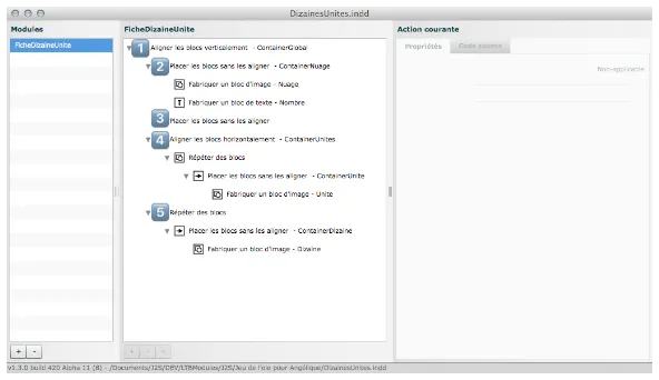 À côté du fichier InDesign DizainesUnites.indd que j’ai utilisé pour fabriquer les briques se trouve un fichier XML FicheDizaineUnité.xml, c’est le module — le plan —. Dans J2S Module Editor, je désigne le fichier InDesign ; comme il n’y a qu’un module associé à ce fichier, c’est le bon qui est directement ouvert.
