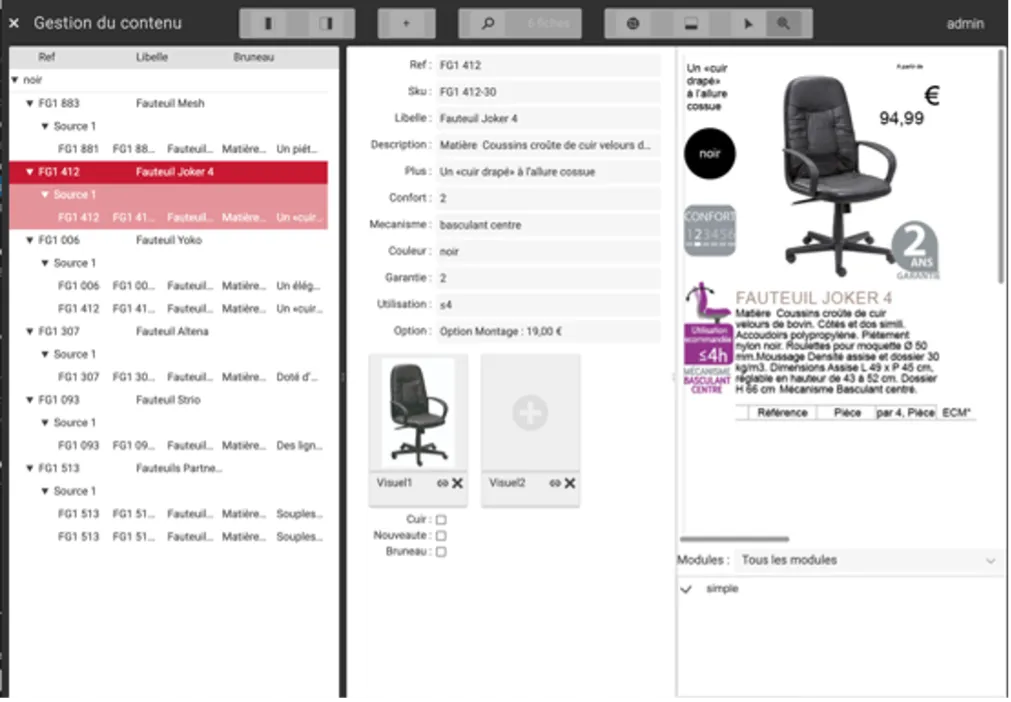 We then started the second step, which was to identify the means to be used to inform our offers. Depending on the number of offers to publish (10, 100, 10,000, more, much more?), we connected our offers to existing data sources, and identified the data to enter or manage (life cycles, validations, etc.). Simple Workspace made this possible with its multiple sources, Excel imports, connectors and workflows. When needed, our offerings became the “command center” for content aggregation.