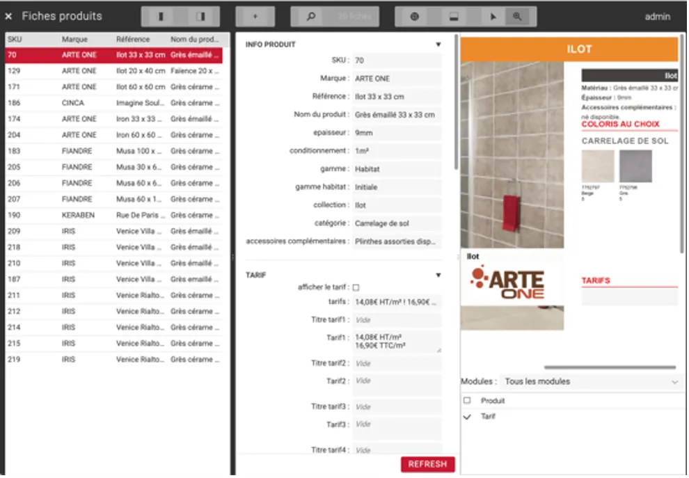 Then, J2S Module Editor enables to describe the rules to transform these data (in connection with the InDesign templates) into a graphic form: layout and styles of texts, images, construction of tables, inserts, reminders, cross-references, etc. From that moment on, each offer sheet showed us the result, allowing the people working on the data to have an immediate overview of their work.