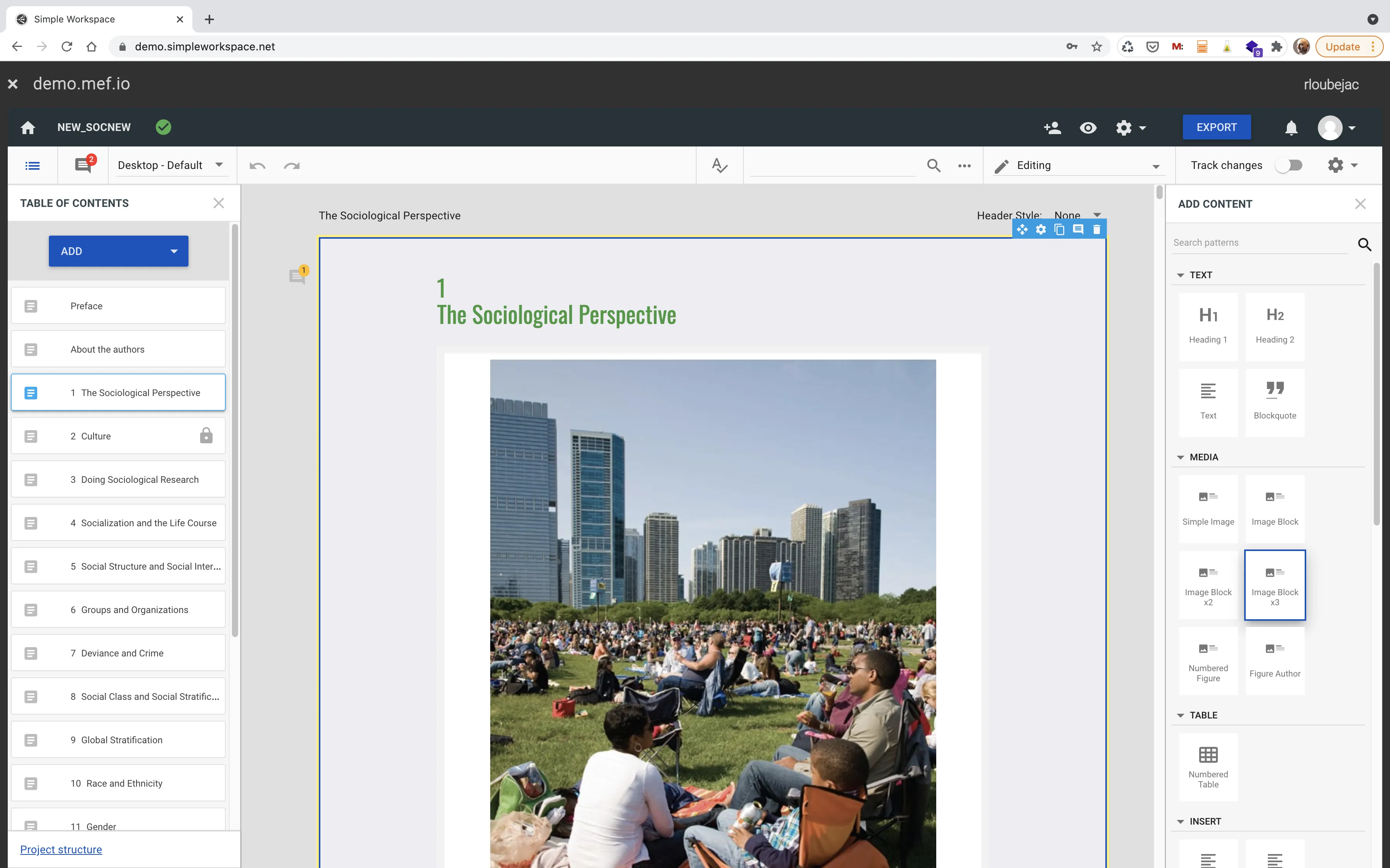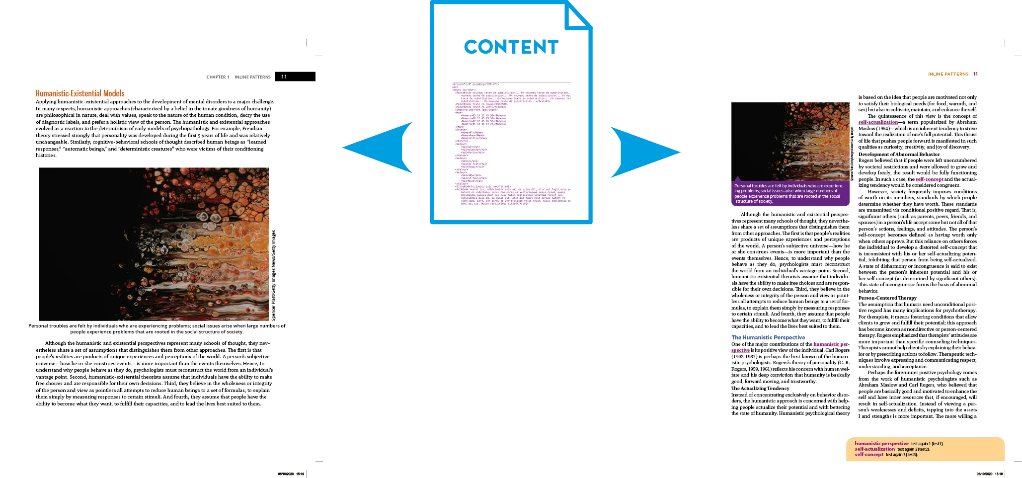 Selon la charte, c’est la présence, dans le flux de données, d’une catégorie de contenu qui déclenche le pilotage de la mise en page dans le document InDesign. Ainsi, le flux de texte principal peut être interrompu momentanément par un encadré constitué d’une image accompagnée de sa légende et du crédit (ex. Image block), ou encore la définition d’un terme créée lors de la saisie dans un système d’authoring comme MEF 4 sera positionnée à côté du terme défini, dans la marge du document InDesign généré.