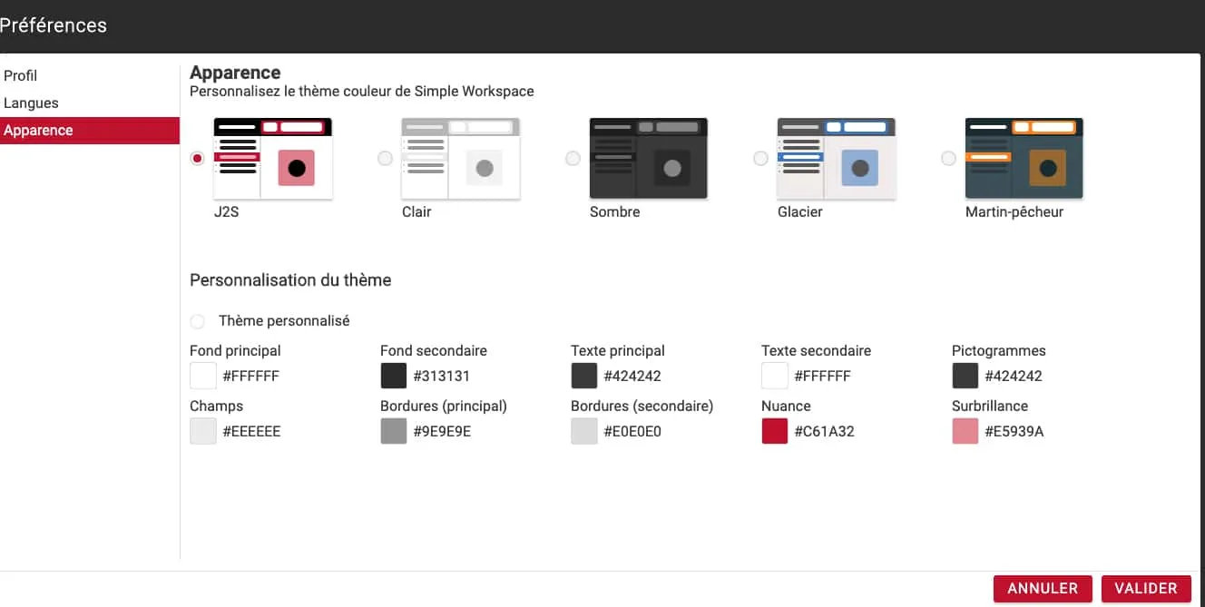 - Vous choisissez entre plusieurs skins et personnalisez les couleurs de l’affichage pour disposer de l’environnement qui vous convient. Attention, c’est l’administrateur qui décide des options vues par les utilisateurs ;