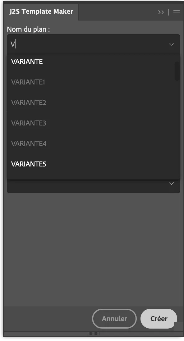 Therefore, J2S created the first version of J2STemplateMaker in 2018 to speed up work in Adobe Illustrator and automate visual exports. The goal is to save time and limit the risk of mistakes: the solution allows to build a document by dynamically adding sections and artboards according to actual product-related needs. This avoids the need for users to use a multitude of Illustrator document templates, often heavy, containing all the sections and artboards potentially required by a given product. To secure the process, the names of the work plans and sections are subject to a naming convention, if necessary, to respect the organization’s charter and reduce the risk of error during input. Thus, when creating a section or a work plan, the J2STemplateMaker palette offers a predictive input to control the name assigned by the user. For example:
